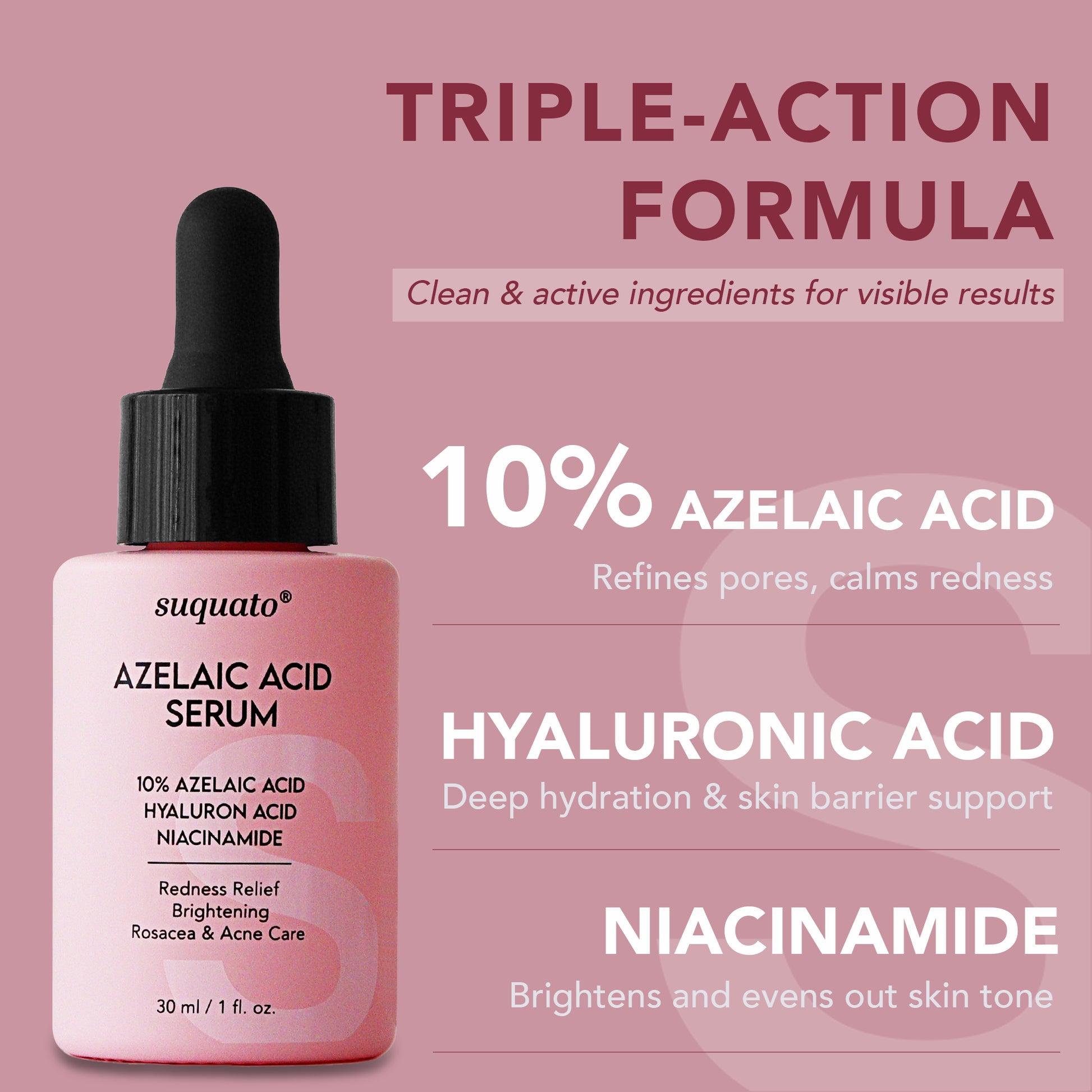Powerful multi-action serum combining Azelaic Acid, Niacinamide, and Hyaluronic Acid for comprehensive skin care.